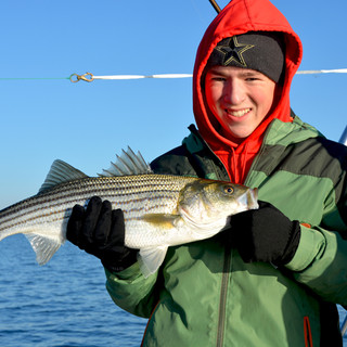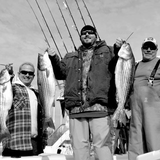 Ackerman’s 30-foot Sport Craft. Ackerman isn’t a guide, but he fishes a lot and has a commercial hook and line license, which lets him tag and sell a few dozen fish a year. My first trip was a family outing when my brother Dana and his boys Jake and Luke were visiting. It was their first time trolling for stripers and, while it took a while to find the fish, we had enough action to scratch out a limit of two fish per person. Luke, age 11, got to crank in the largest of the day, a 34-inch beauty.