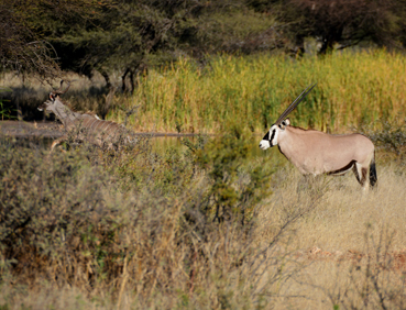 My safari was in its next-to-last day. The abundant wildlife where we were hunting had me thinking as much about photography as getting a gemsbok. When a respectable old bull offered a chip shot shortly after daybreak, I passed, telling Taylor we could return to that location later after we had ridden around and took advantage of early morning light for photography. Plus, mornings had been warming quickly. I silently worried that taking an animal too early might necessitate an early departure – one before I had a chance to shoot photos.
