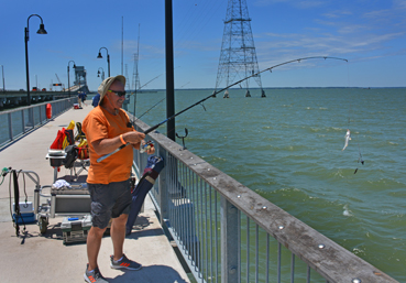 Wendy Fulton, a computer coding teacher who recently moved to the Hampton Roads area from Brooklyn, New York, was steadily moving from one side of the pier to the other. While she had a line in the water on the pier’s north side, her primary attention was on the two crab pots she placed on the south side. “They sure seem to like turkey necks,” she said. “If I catch enough, I’ll take them home and steam them up for a meal.”
