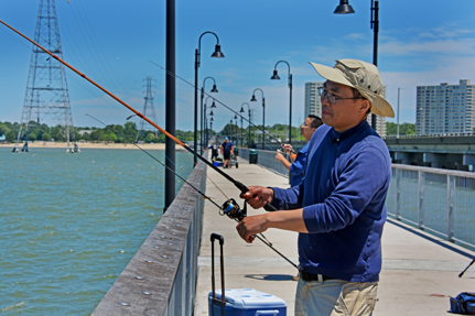 Donald Moore, a transplanted New Yorker from New Rochelle to Williamsburg, had the end of the pier all to himself during a midweek visit. “I fish here every Tuesday,” he said. “I’m usually lucky down here. This is a comfortable, big pier and it’s not too crowded.”