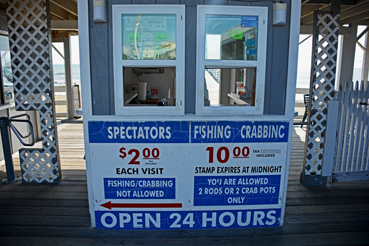 Fishing is $10 for adults and $5 for children under 12. Spectators are $2. These are all day passes. The pier opens 24 hours from Memorial Weekend thru the annual Neptune Festival week at the end of September. Off-season hours (April through late May and October) are 8 a.m. to 8 p.m. Nearby parking is $15 a day. The pier has a restaurant at the pier and a fairly well-stocked bait and tackle shop and a fish-cleaning station. For more details, call 757-428-2333.
