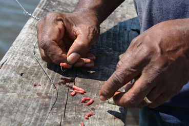A local Head Start program was staging a Daddy/Daughter Fishing Day in July during our visit. Several dads and their young children were trying to catch fish. One dad, Jay Roche, had brought a couple rods and reels, including a pint-sized child’s combo with a two-hook bottom rig tied on. The trouble was, he forgot to bring hooks. No worries. A quick check of anglers at the end of the pier found fisherman Moonilal “Moon” Ramdhan. He reached into his tackle box and pulled out a full bottom rig, complete with hooks, and within minutes young Khloe Roche, age 4, was in smiling business.